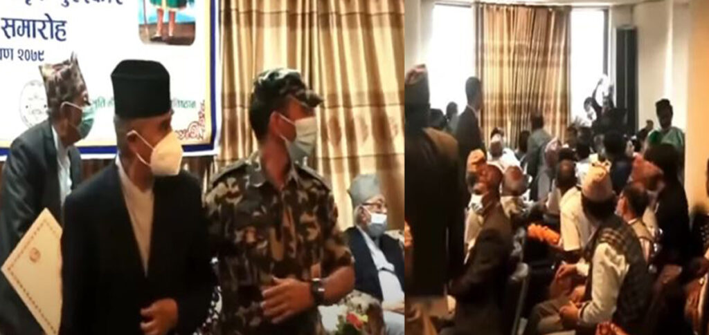 भीमसेन थापा स्मृति प्रतिष्ठानको कार्यक्रममा प्रधानमन्त्री शेरवहादुर देउवाले सम्बोधन गर्न लाग्दा ३ जना युवाले नागरिकता विधेयक र एमसीसीको विरोध गर्दै नाराबाजी गरेका छन् ।